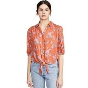 Free People Celia Floral Print Tie Front Button Up Short Sleeve Blouse Orange L