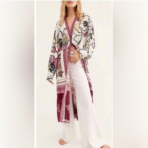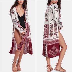 Free People "C'est Moi Mixed Print Maxi Top" - luxurious bohemian romantic long cardigan in floral design with dropped long sleeves, high side slits, buttons closure. Lightweight fabric, relaxed fit. Glamorous style, indeed!