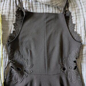 I took the pictures is full sunlight but the dress is black. The brand is free people. High neck dress with side cut outs and open back. The shape is fit and flare/ A-line. Waist is 12.5 inches flat but material is stretchy, length from top to bottom is about 28 inches.