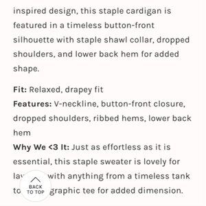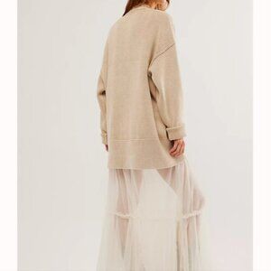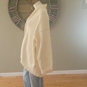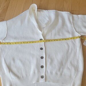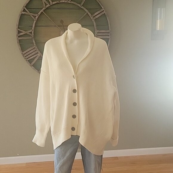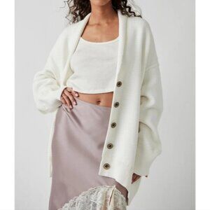 Free People Chamomile Cardi in Ivory. Front button down closure seam and ribbed trim details shawl collar dropped shoulders in a cocoon inspired design pictures taken of approx measurements. Slouchy Oversized timeless classic essential 100% cotton