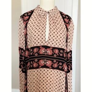 V-neck tunic with a relaxed fit, cinched long sleeves, and front button closure.