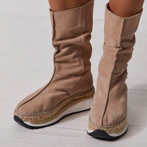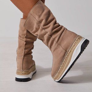 Features: Mid-calf length, suede uppers, slouchy style, sneaker base, platform rubber sole, natural jute detailing