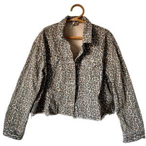 Free People Cheetah Leopard Cropped Denim Jacket Raw Edge L $108