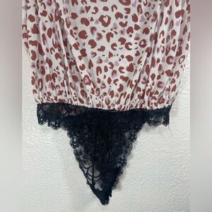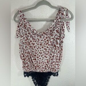 Free People Cheetah Print Body Suit Lace Women’s Large Tie Adjustable Strappy Sleeves. The free people tag is cut off. 100% Viscose. Hand wash.