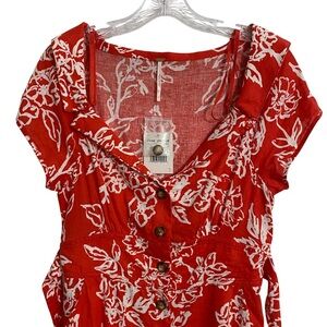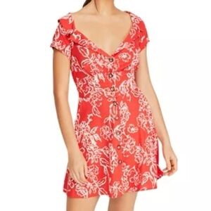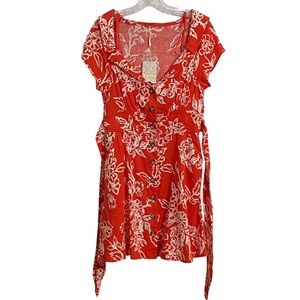 Free People mini dress- New with tags, in red tropical floral print, linen blend, front pockets.