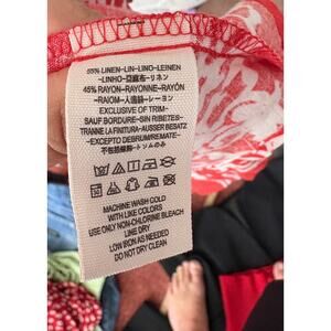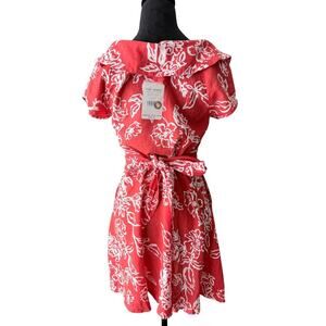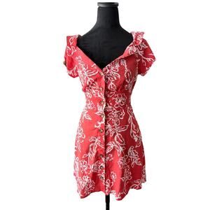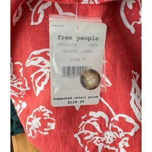 Free People cherry combo button-front mini dress in a red and white floral print. Size 6. Features short ruffle sleeves, a wide collar, wooden-look buttons, and a matching self-tie belt. Crafted from a breathable 55% linen, 45% rayon blend. Brand new with tags, original retail $128.