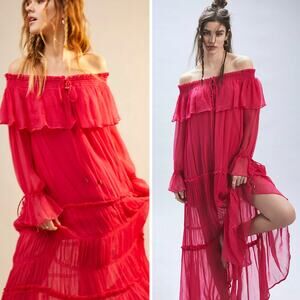 Turn heads in this so special maxi dress featured in a timeless tiered silhouette with off-the-shoulder top piercing and sheer bottom detail for added dimension.