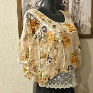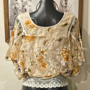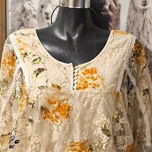 Elegant floral lace women's top featuring a blend of cream and orange hues. Perfect for adding a touch of sophistication to any outfit.