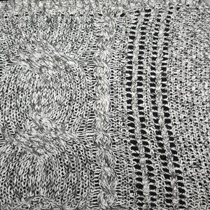 - The texture features large cable knit paneling and striking open-stitch / ladder-stitch panels, adding a semi-sheer, textural element
