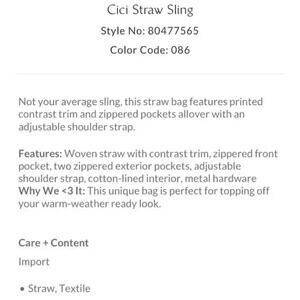 Features: Woven straw with contrast trim, zippered front pocket, two zippered exterior pockets, adjustable shoulder strap, cotton-lined interior, metal hardware