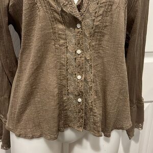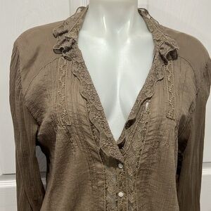 Free People Clemence taupe lace trim long sleeve button down boho shirt Medium