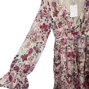 Free People Closer To The Heart Mini Dress. Floral print. Cream combo with pink details. Long sleeves with tie cuffs. Lined. Lightweight and romantic boho style.
