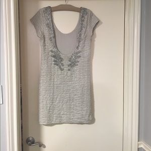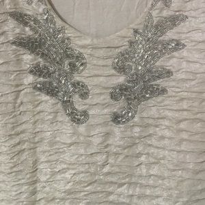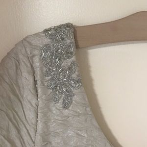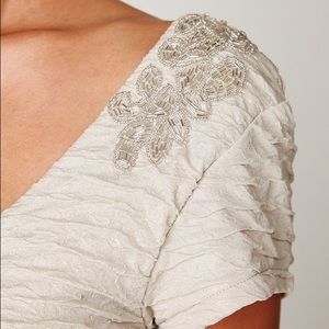 The same dress on model but more of an off white dress with metallic sheen, with metallic/silver beading. So beautiful on. A few beads missing but in good condition.