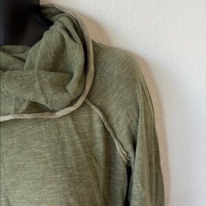 This long sleeve is a darker heathered olive color. Raw edge details. Cowl neck. No size tag but it's about a women's L. Gently used condition. 22” bust, 24” length.