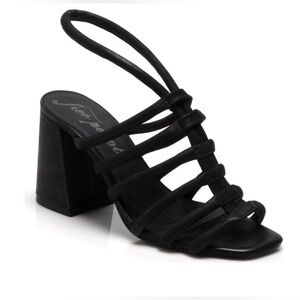 So striking and strappy, these stunning Colette Cinched Heels are teatured in a slip-on style and black buttery soft leather with chunky round straps, a square-toe footbed and bold pyramid-style block heel. Rubber outsole with lined footbead. Please Note: Ankle strap is fully adjustable, simply pull for a tighter or looser fit.