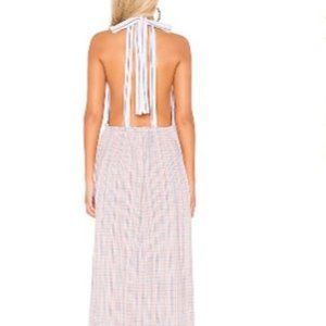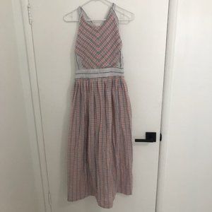 An open back, mixed pattern, and halter neckline complete this Color Theory midi dress.