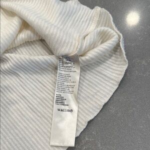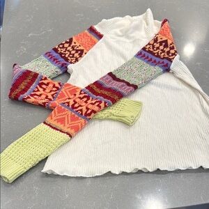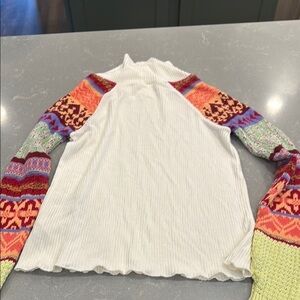 Chic cowl neck sweater with vibrant sleeves. Features cream body with red, orange, green, and blue patterns. Ideal for a stylish, cozy outfit.