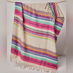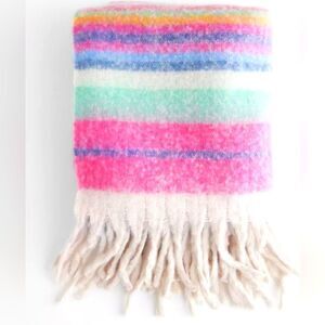 Soft and cozy throw blanket. Features vibrant colors and fringe detailing. Perfect for adding a pop of color to any room.