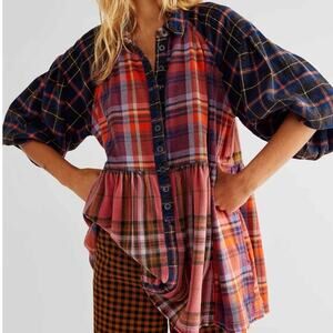 Chic plaid blouse with button-up front. Features vibrant colors and short sleeves. Ideal for casual outings.