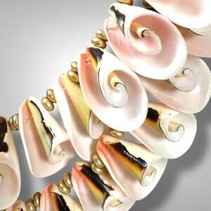 Features: Beaded style, layered design, statement shell adornments, metallic accents, adjustable clasp closure