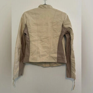 This is a listing for a preowned Free People Cool & Clean Vegan Leather Moto Jacket Cream Size 6 Wool Blend. I see a small spot, highlighted in photo. Have not attempted to clean it. Approximate measurements in photos. Please see all photos for details as they are part of the description.