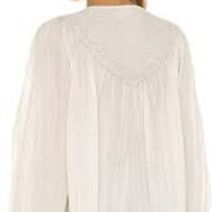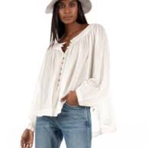 Style a breezy, feminine look in this lightweight peasant blouse with a button front and topstitched details. Fit: this style runs large, order one size down. - Scoop neck - 3/4 length sleeves with single barrel cuffs - Front button-loop placket - Textured stitched yoke - Gathered - Lightweight woven construction - Semi-sheer - Approx. 24" length (size S) - Imported