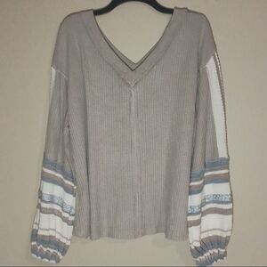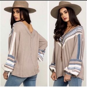 Free People Copenhagen Slouchy Thermal Pullover Sweater accented with Colorful Knit Trim. Long Wide Sleeves with Elastic, V-Neck, Loose Fit, with Unfinished Edges and Contrasting Detail on the Sleeves and Neckline. Excellent Like New Condition.