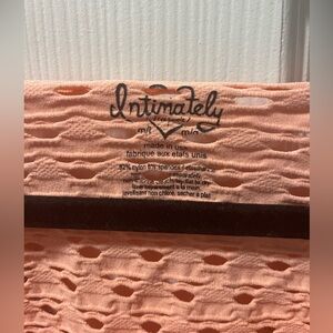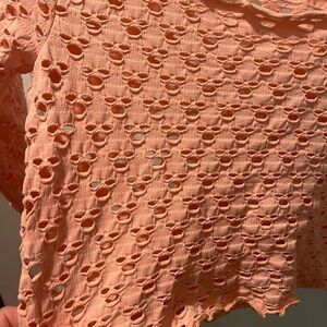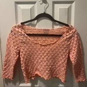 Chic coral lace blouse with three-quarter sleeves. Cropped design adds flair.