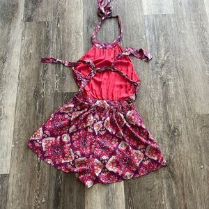 Free People Coral Tides Pink Print High Neck Tie-Back Sleeveless Romper Boho