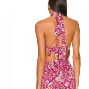 Step out in style with this beautiful Free People Coral Tides Pink Print High Neck Tie-Back Sleeveless Romper in size Lg. The floral pattern and strap accents give a bohemian vibe, perfect for a beach or love-themed occasion. The lightweight and breathable material make it ideal for summer, fall, or spring.
