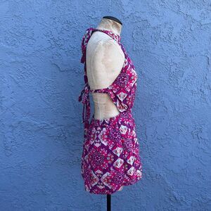 Purple and pink floral halter romper with elastic waist and tie back. Free People Coral Tides romper in Hollyhock. Size small. One small area resewn and small hole in back ties.
