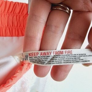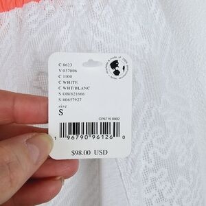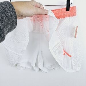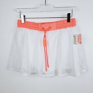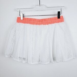 Stylish skort with coral waistband. Features a white lace overlay. Perfect for casual outings.