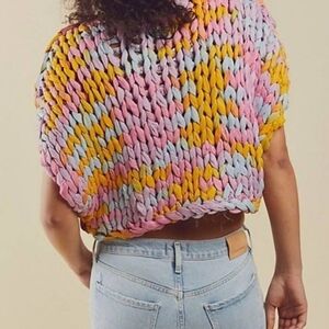 Boxy Fit, Chunky Knit, Open Dolman Sleeves, Rainbow Cotton Candy Colors. Shades of Pink Blue Yellow Gold. NWOT 100% Viscose, Hand Wash. Gorgeous Statement Top!
