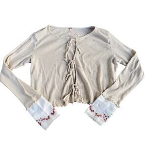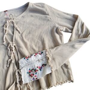 Free People Cottagecore Tie Front Floral Detail Oatmeal Cardigan - Small