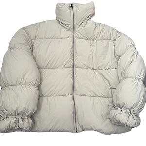 Features: Puffer style, nylon fabrication, stand collar, zipper closure, balloon sleeves with tie details at cuffs, pockets