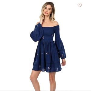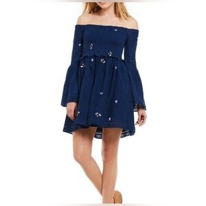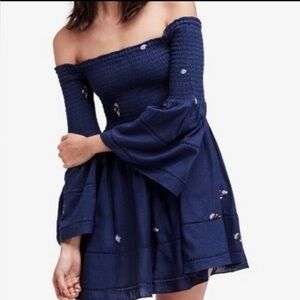 Free People Counting Daisies Navy Blue Off The Shoulder Embroidered Dress M
