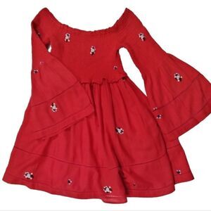 Free People Counting Daisies Dress Sz M Red Off the Shoulder Embroidered