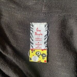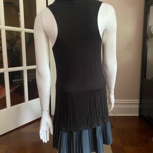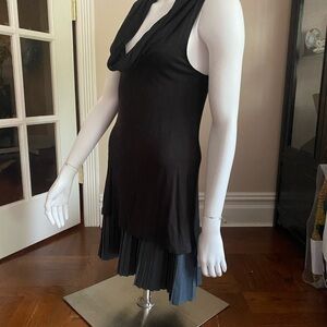 Free People sleeveless dress with cowl neck and pleated skirt. The body is black made a very soft rayon. The skirt is gray made of cotton poly blend. It’s in very good preowned condition.