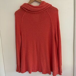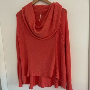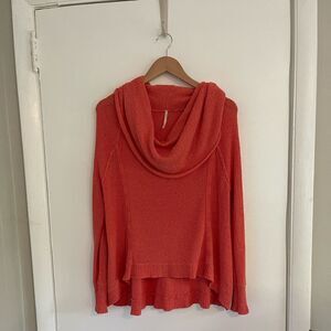 Cowl neck sweater by Free People in a Coral/Orange color. Slouchy fit. High low hem. Ribbed cuffs and hem. Gently worn with no flaws. Measurements in photos.