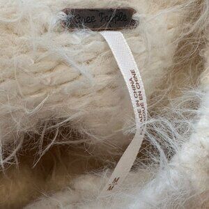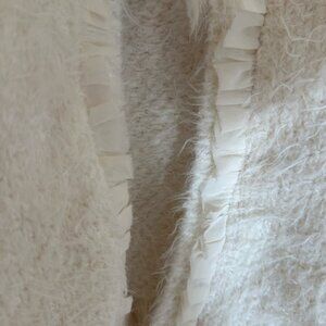 Chic cream sweater with sweet ruffles and feminine details. This sweater is incredibly soft and actually very warm. One tie at the top creates a cute bow and makes this sweater perfect for holiday parties and adding a cozy elegance to your wardrobe.