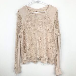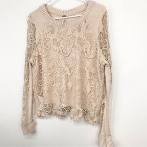 Free People Cream Crochet Lace Slit Back Pullover Crew Neck Boho Sweatshirt
