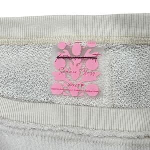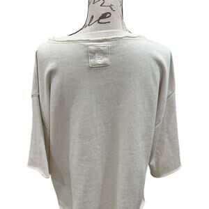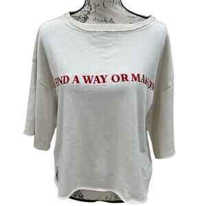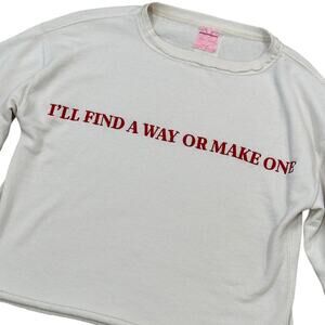 Stylish cream crop top. Features bold red text. Comfortable and trendy.