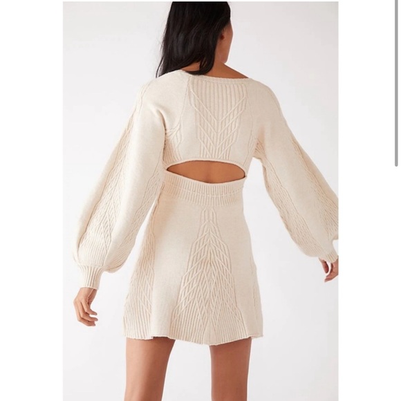 Elegant cream knit dress. Features open back design. Long balloon sleeves. Perfect for casual outings.