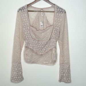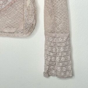 Elegant cream lace blouse. Features intricate patterns. Long sleeves with flared cuffs. Perfect for a chic look.