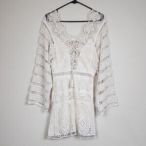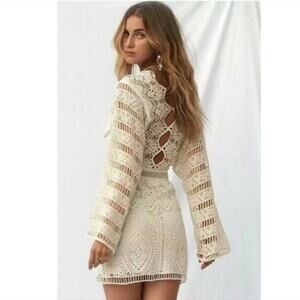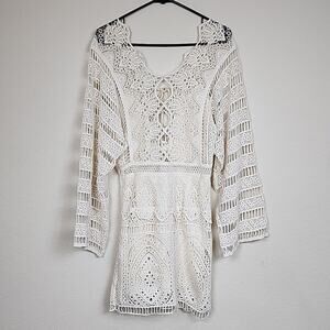 Elegant long sleeve dress. Intricate lace design. Crisscross front detail. Perfect for special occasions.