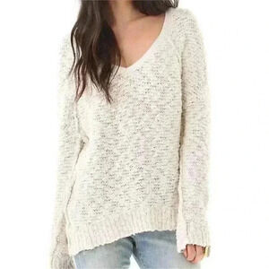 Free People Cream Open Knit Popcorn Texture V Neck Chunky Oversized Sweater XS