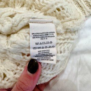 Fairly loose knit (read: you can see skin through the gaps) cream cable knit sweater originally purchased from Free People in 2018 ("Crashing Waves Pullover"—size XS but the fit is very slouchy/oversized. Neckline is a fairly deep V. Worn in light rotation for a few years and hoping to find a second home! Item was given to me as a gift, so original price is a guesstimate.