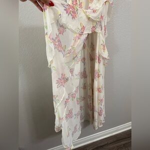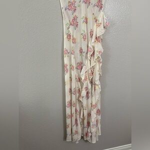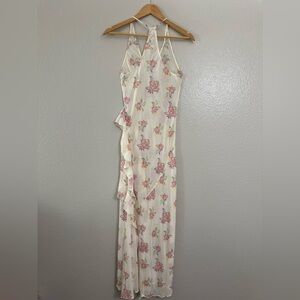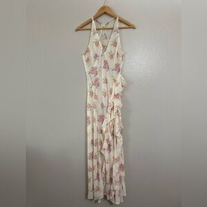 This sleeveless maxi dress by Free People features a halter neckline and a flowing silhouette, perfect for resort wear. The cream base is adorned with a delicate pink floral print, adding a touch of romance to its airy design.