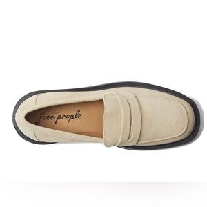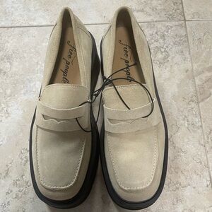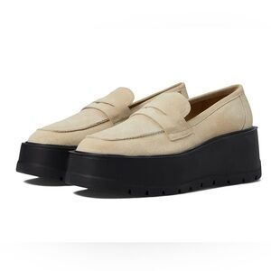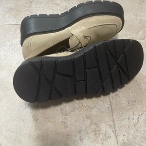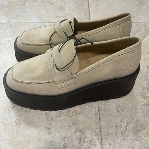 Stylish cream loafers with a bold black platform. Perfect for a modern look.
