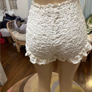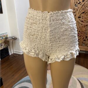 Knit stretchy cream shorts with ruffled details. Cute and sexy